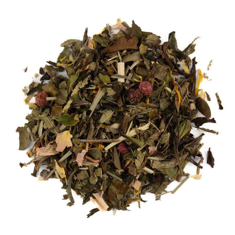 Mix van Groene thee, Witte thee, Verbena blad, Natuurlijke aroma, Lemon gras, Zwarte bessen, Rode rozenbloesem, Zonnebloem en rode Bessen.